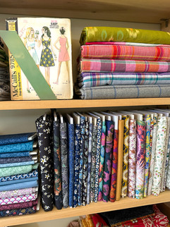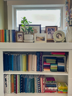Open shelving is my favorite storage solution. Everything is visible and it's an opportunity to have fun with color and cool containers. I store most of my fabric on open shelving (in areas out of the sun), and then I mix in my patterns, containers with trims and zippers, and all my quilting and sewing books. I include fashion and design books I use for inspiration, and then because I don't have a separate library (ha!), I also have my entire book collection - just in case you want to read a British spy novel during tea breaks.